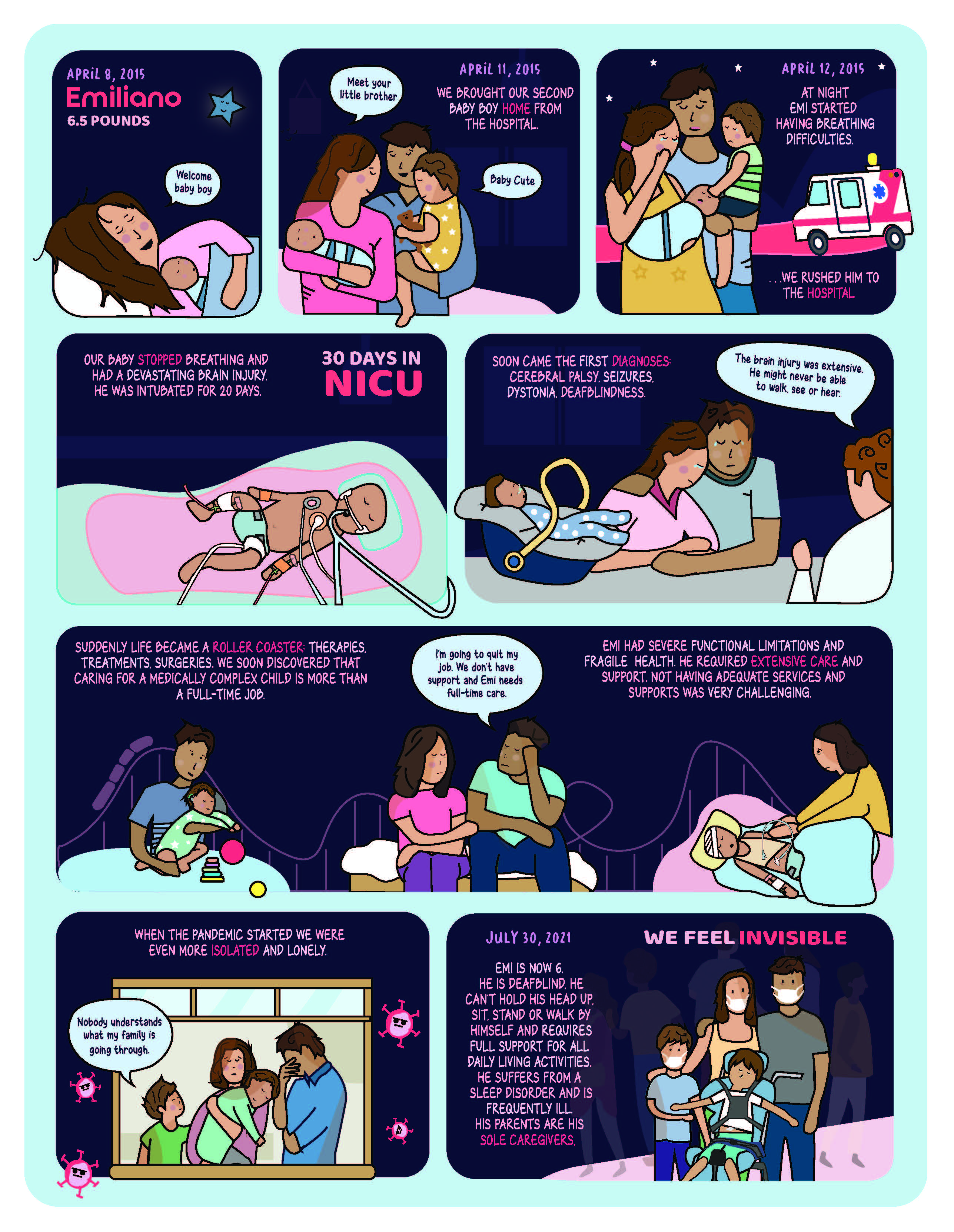 Suddenly life became a roller coaster:Therapies, treatments, surgeries. We soon discovered that caring for a medically complex child is more than a full-time job. I’m going to quit my job. We don’t have support and Emi needs full-time care. Emi had severe functional limitations and fragile health. He required extensive care and support. Not having adequate services and supports was very challenging.